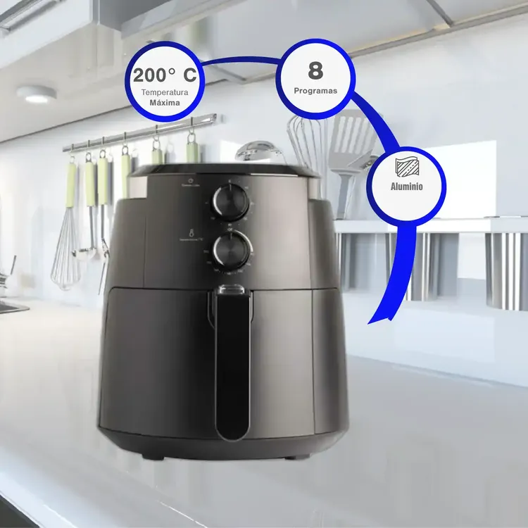 Con su capacidad de 3.5 litros, es perfecta para preparar porciones grandes para toda la familia. Su potencia de 1500W garantiza eficiencia y rapidez, mientras que su temporizador de 60 minutos con apagado automático y la posibilidad de alcanzar hasta 200°C te ofrecen control y seguridad en cada receta.